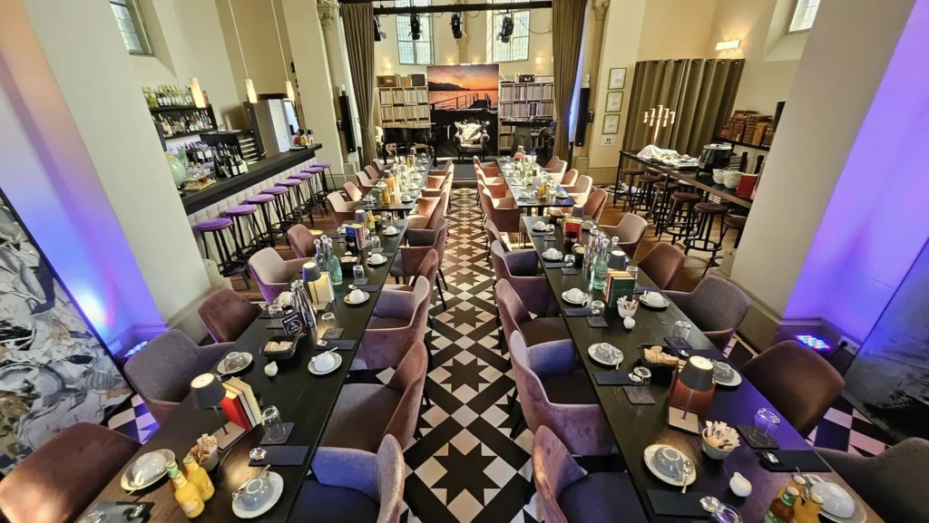 Em Limburg, uma igreja histórica virou restaurante e salão de eventos, onde os vitrais iluminam taças de vinho e pratos gourmet.